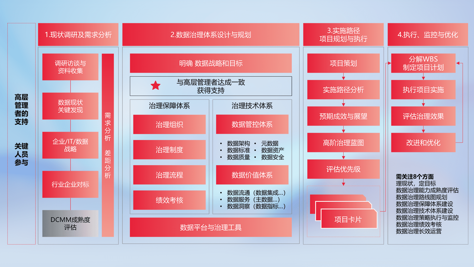 制定并执行统一的数据标准,,,规范数据定义和格式,,,消除冗余和不一致性,,实现跨部门和跨系统的数据一致性,,,,为企业提供标准化的数据基础。。